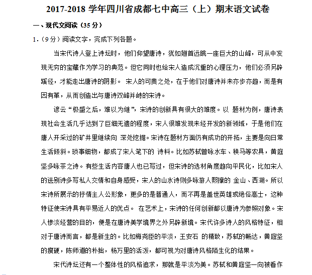 2017-2018学年四川省成都七中高三(上)期末语文试卷