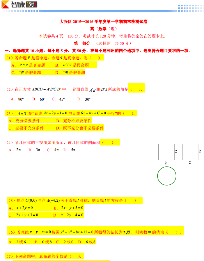 2015-2016北京大兴高二(上)期末理试题答案及解析为大家介绍好了,如果同学们在高中期末诊断准备中还有什么问题的话,请直接拨打智康网高中频道免费咨询电话:4000-121-121,会有专业的高中权威老师为您解答!