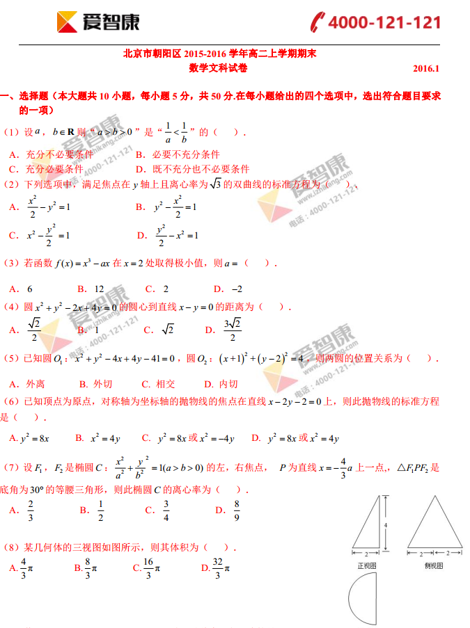 2015-2016北京朝阳高二(上)期末文科高中数学试题答案及解析为大家介绍好了,如果同学们在高中期末诊断准备中还有什么问题的话,请直接拨打智康网高中频道免费咨询电话:4000-121-121,会有专业的高中权威老师为您解答!