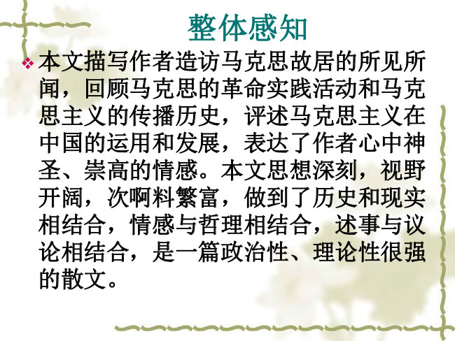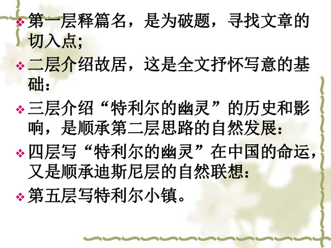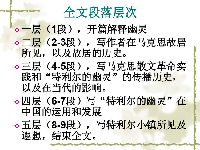 《特利尔的幽灵》课件!理清文章结构层次,把握思想内容。 通过阅读,学习本文将历史与现实相结合,情感与哲理相结合,叙事与议论相结合的写法。下面小编为大家分享《特利尔的幽灵》课件!希望对大家有所帮助!
