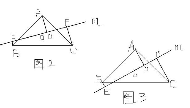 当直线m绕点A旋转到与BC不平行时,分别探究以下两种情况下,线段AD,BE,CF,之间有什么关系,并证明。
