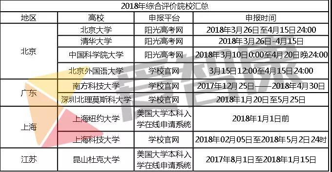 在申请时间上,除了上海纽约大学需要在高考当年1月1号前申请,大部分综合评价院校会在高考当年三月份开始递交申请,可在阳光高考平台或者学校官网进行报考。截止2018年,共有9所院校在京招生。