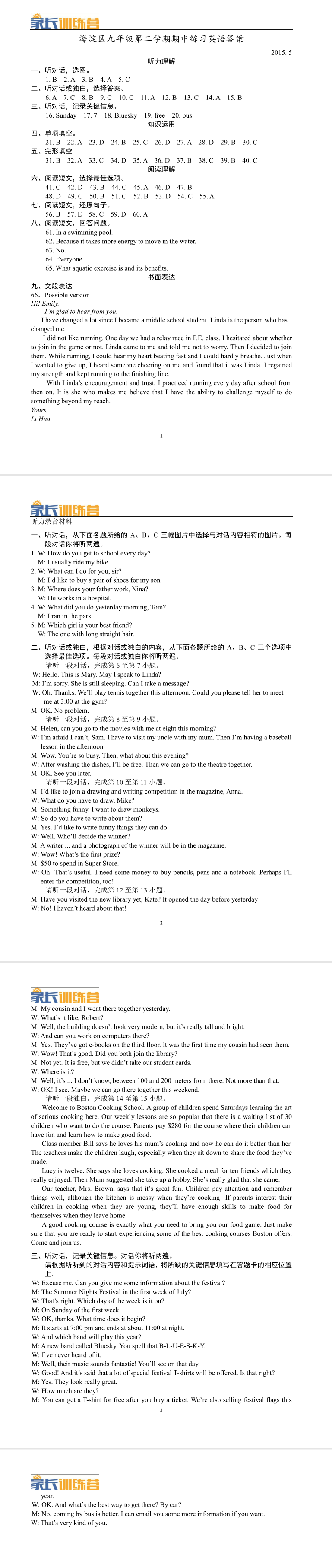 2015年海淀区九年级第二学期期中训练英语答案!英语与其他学科不同,作为一种语言诊断能力固然重要,但是综合交际能力的培养也不容忽视。因此,孩子在进行日常学习的过程中,也要注意通过多种渠道锻炼自己的语言运用能力。下面为大家分享2015年海淀区九年级第二学期期中训练英语答案!希望能够帮到大家!