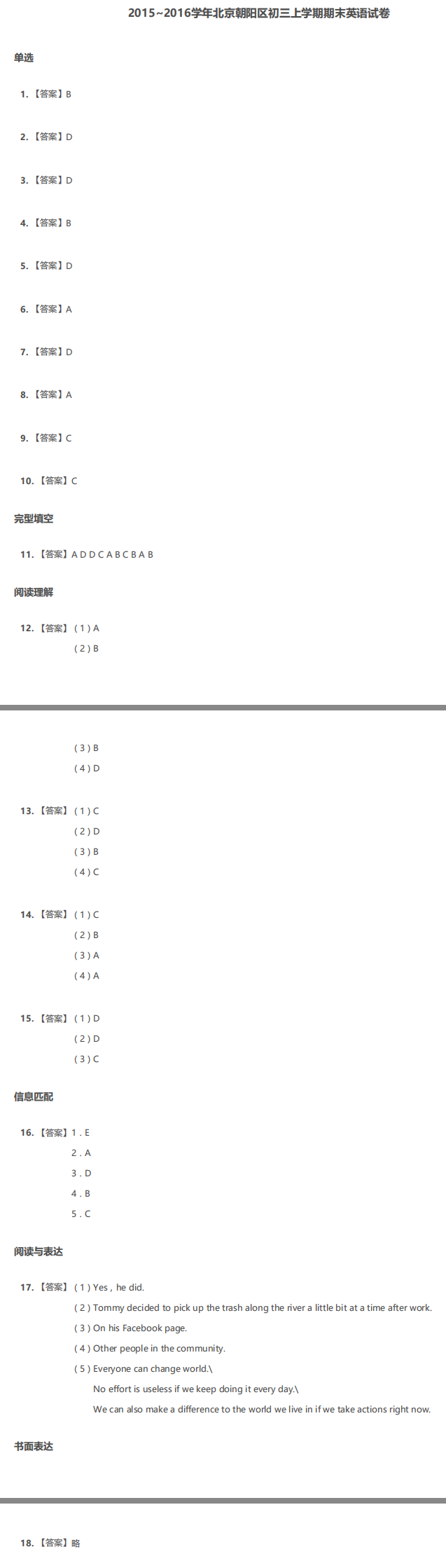 2016年朝阳初三上期末英语答案!课上一定要紧跟老师思路,进行记录。较后,一定要按时进行笔记的二次整理和复习。根据艾宾浩斯遗忘规律曲线,在遗忘的峰值处一定要进行复习。下面为大家分享2016年朝阳初三上期末英语答案!希望能够帮到大家!