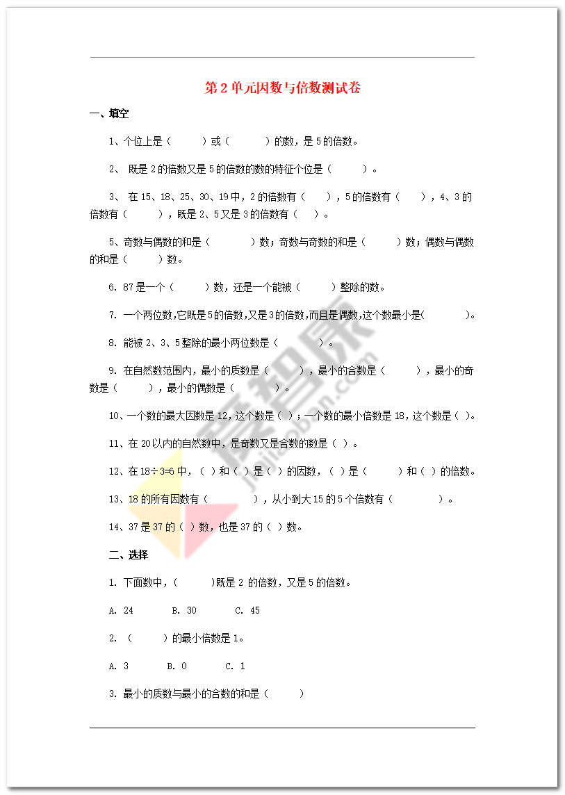 2017-2018学年五年级数学同步训练:第2单元《因数与倍数》诊断题【可下载】!①一个整数能够被另一整数整除,这个整数就是另一整数的倍数。如15能够被3或5整除,因此15是3的倍数,也是5的倍数。 ②一个数除以另一数所得的商。如a÷b=c,就是说a是b的c倍,a是b的倍数。 一个数能整除它的积,那么,这个数就是因数,它的积就是倍数。 ③一个数的倍数有无数个,也就是说一个数的倍数的集合为无限集. 注意:不能把一个数单独叫做倍数,只能说谁是谁的倍数。下面是爱智康小编为您带来的2017-2018学年五年级数学同步训练:第2单元《因数与倍数》诊断题【可下载】!希望可以帮到大家。