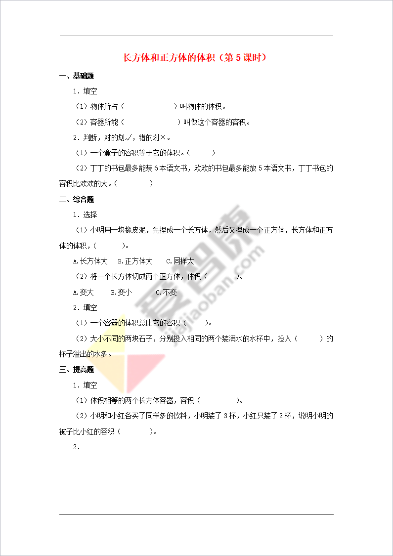 2017-2018学年五年级数学同步训练:3.3《长方体和正方体的体积》(第5课时)【可下载】