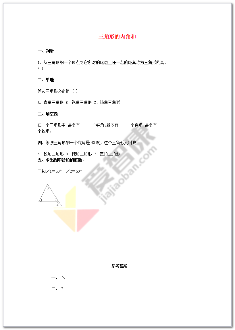 爱智康小学教育频道分享的2017-2018学年四年级数学同步训练:5.3《三角形的内角和》【可下载】到这里就结束啦,更多有关小学数学的其他问题,请直接拨打免费咨询电话: