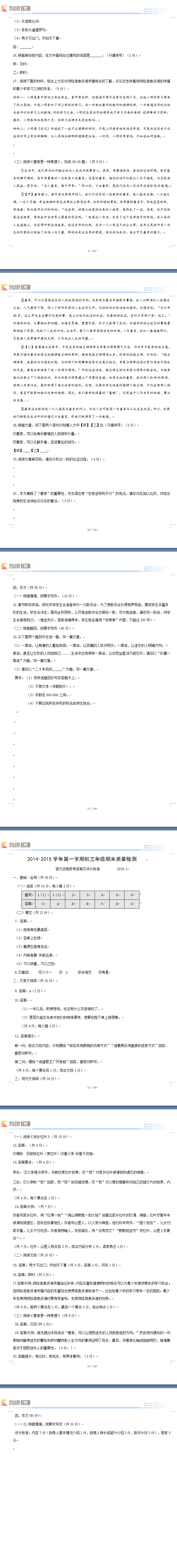 爱智康初中教育频道分享的2015年昌平初三上期末语文试题及答案到这里就结束啦,初中阶段语文学习的主要任务,首先是积累大量的语言材料,其次才是理解和运用。更多有关初中辅导的课程,请直接拨打免费咨询电话:
