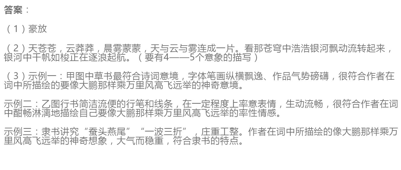 (3)下面是三幅“九万里风鹏正举”的书法作品,请选出你认为较符合本诗词意境的一幅,结合书体特点简要写出选择理由。