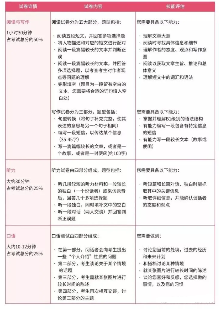 和KET构成类似,都是由三部分试题组成:阅读与写作、听力、口试。阅读与写作占诊断总分的50%。听力、口试各占总分的25%。
