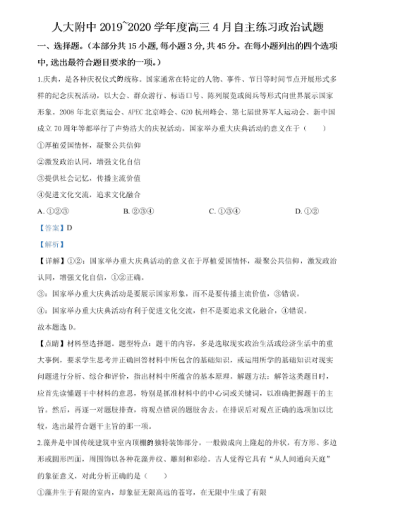目前暂未收集到2021北京人大附中高三零模政治试题答案,收集到后先进时间在本链接进行更新,所以大家可以保持关注,下面将为大家带来往年试题,请广大考生来参考!