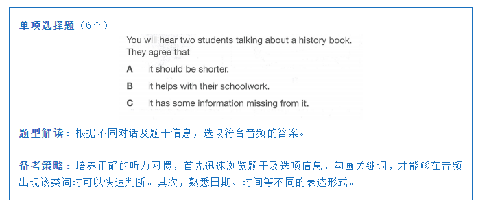 听几段较短的听力材料和一段较长的独白,一个说话者或采访录音后,回答几个选择题