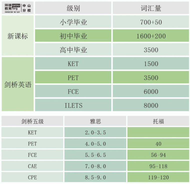 从上表可以看出,剑桥通用英语语比国内新课标的英语,在小学这一阶段,KET对孩子的单词量要求多了一倍,几乎是新课标中对初中生的要求。