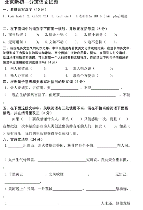 北京西城区新初一分班考语文!同学们要重视分班考,这个分班考是很关键的,可能关系到同学们未来的初中生活,同学们在假期里要把语数外三门功课都复习好。下面,小编为大家带来北京西城区新初一分班考语文。