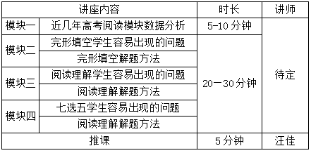 针对高三高考和高二选考考生,由于阅读模块在150分的试卷中共占60分的分值,占比高,技巧多,通过讲座的形式更加直观、便捷地明确该模块学生容易出现的问题以及提升方法,引导短期课。