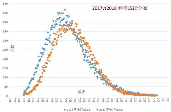 2018年上海春考考生人数是4万5,17年是4万,从考试院公布的成绩分布表来看今年春考成绩整体上升,是否是因为那多出的5000个考生?来看看各位大神的平均分预测。