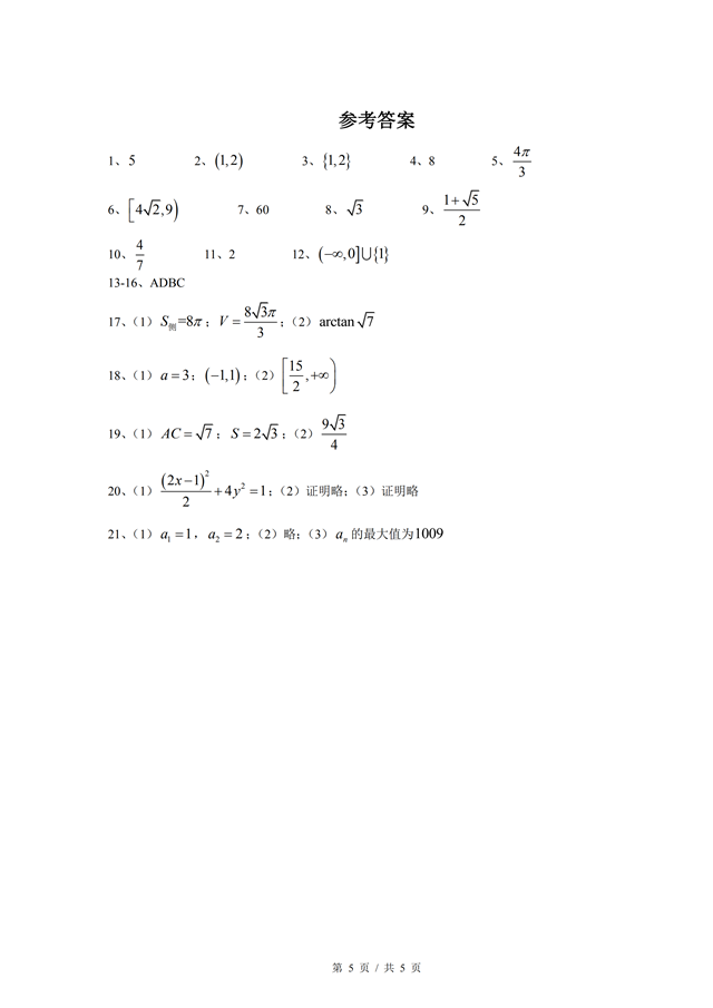 2019上海虹口区高三一模数学试题及答案(5)
