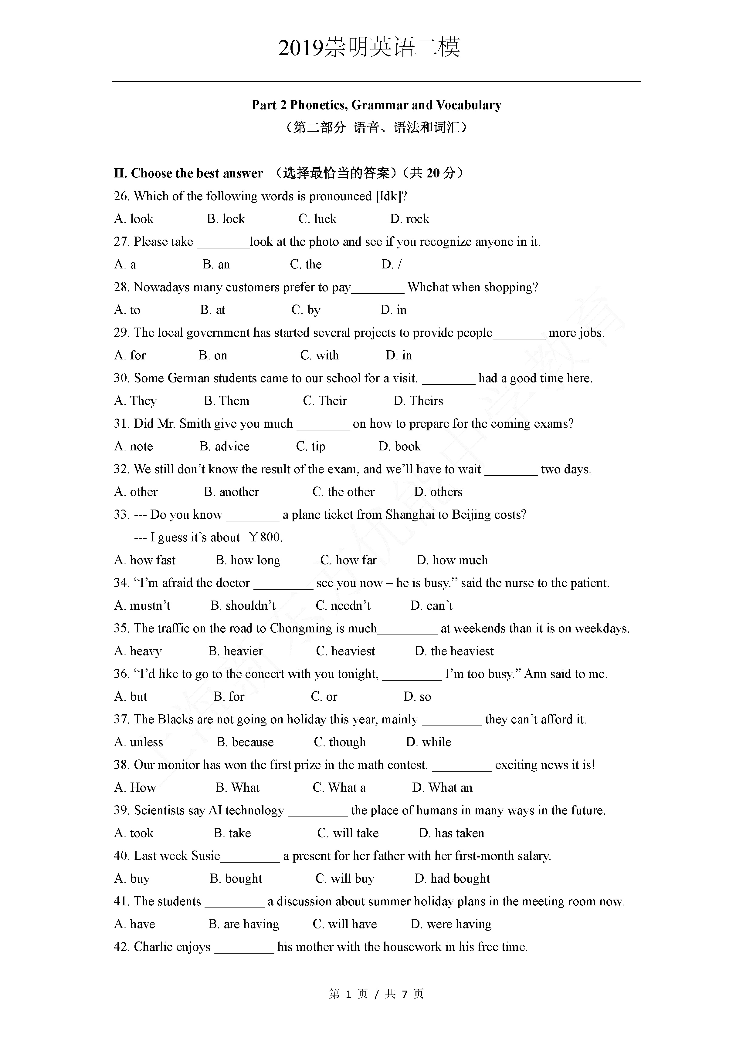 2019上海中考二模试题及答案汇总!一年又一年,周而复始,时间总是在和同学们赛跑,这么快,就要进入中考的最后阶段了,同学们有没有好好的准备啊?下面上海学而思爱智康为大家带来2019上海崇明区中考二模英语试题及答案。