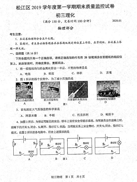 2020年上海的初三一模大部分地区已经考完了!今天小编为大家搜集了“2020年上海松江区初三一模物理试题”大家一起来看看这个区的题型吧!需要辅导帮助可直接致电:4000-121-121!