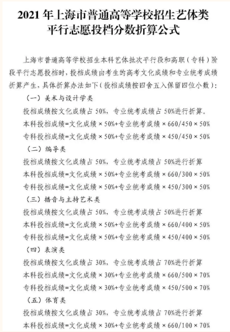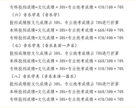 本科艺体类批次顺序段按考生志愿全部投档;平行段根据考生高考成绩和专业统考成绩折算后产生的投档成绩按1:1比例投档。美术与设计学类、编导类、播音与主持艺术类按高考成绩和专业统考成绩各占50%折算产生投档成绩;表演类、体育类、音乐学类(音乐学)、音乐学类(音乐表演-声乐)、音乐学类(音乐表演—器乐)按高考成绩占30%、专业统考成绩占70%折算产生投档成绩。
