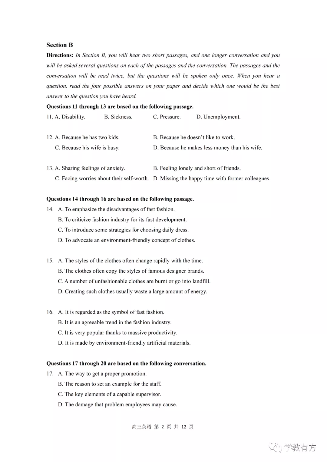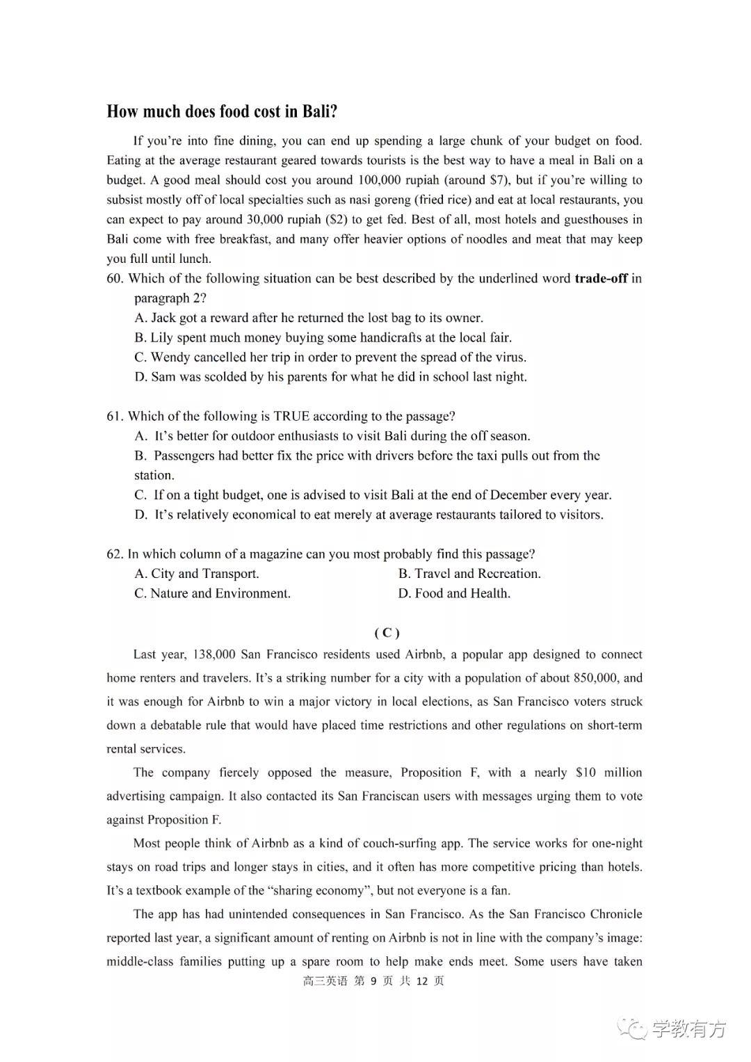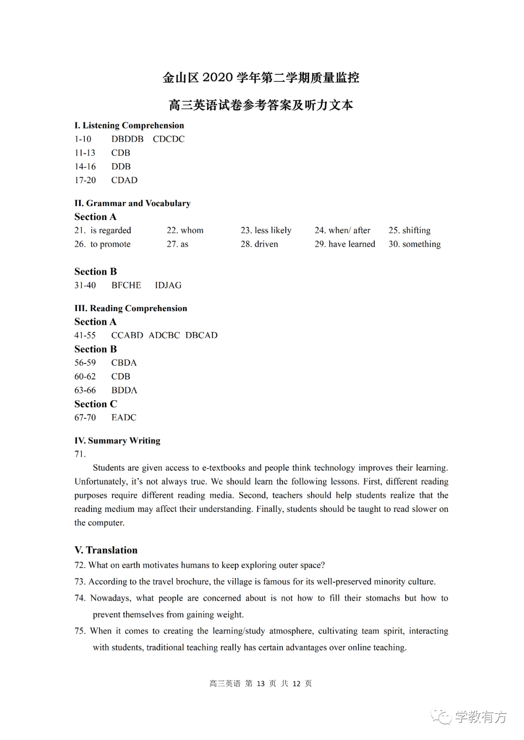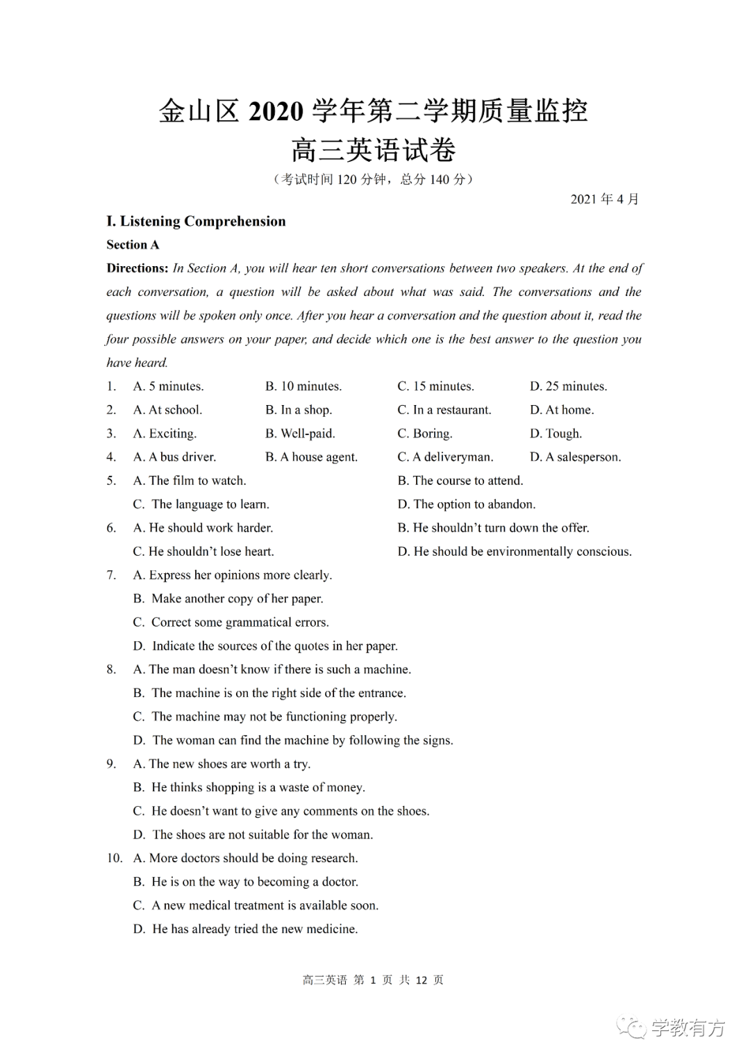 金山区高三二模英语试卷