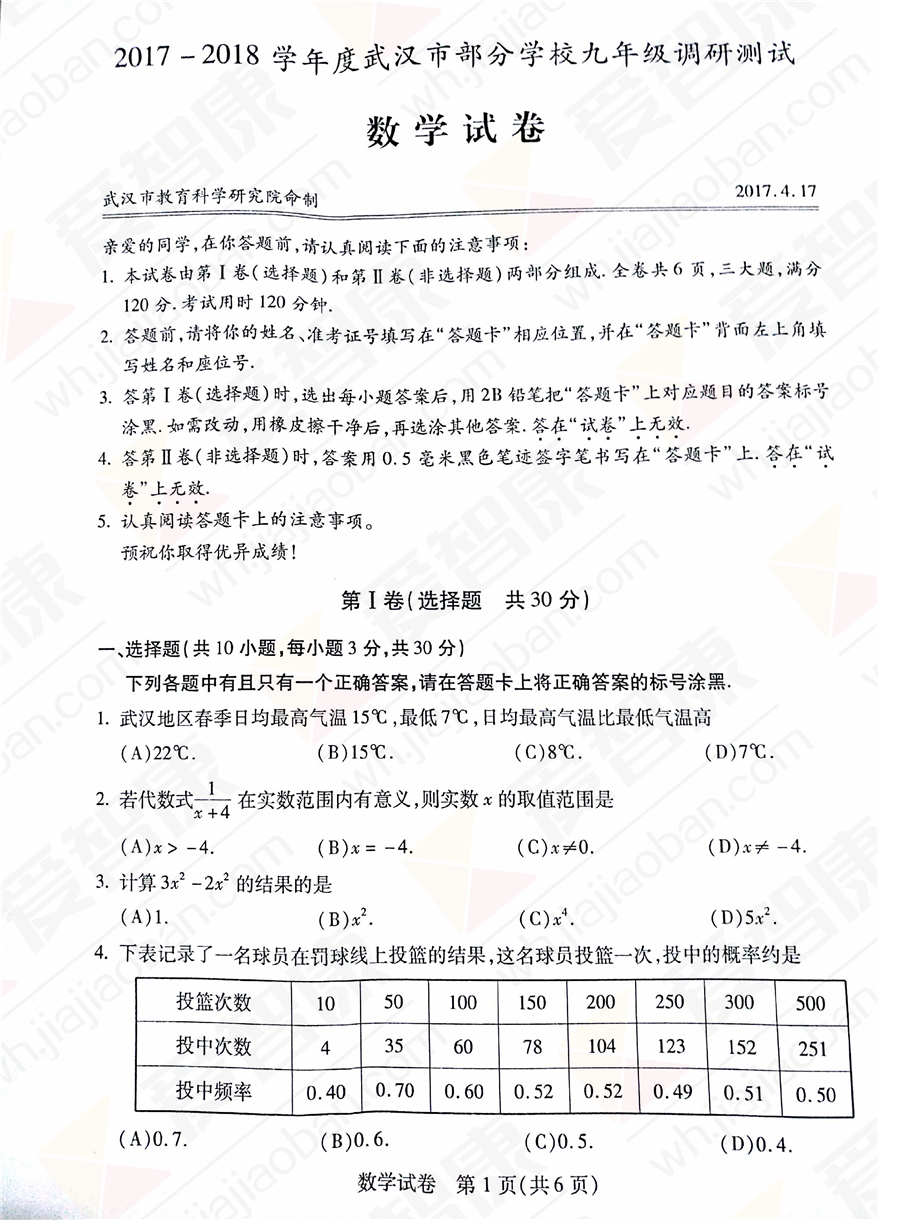 2018年武汉初三年级的四月调考的考试时间为4月17-18日。四月调考一般就是当年中考的模式,对于中考报考具有重要参考价值。武汉爱智康为大家收集整理了2018武汉初三年级四月调考数学试卷的试卷资源,以供大家备考复习参考。(推荐阅读:汇总丨2018武汉初三年级四月调考各科目试卷/答案/解析)