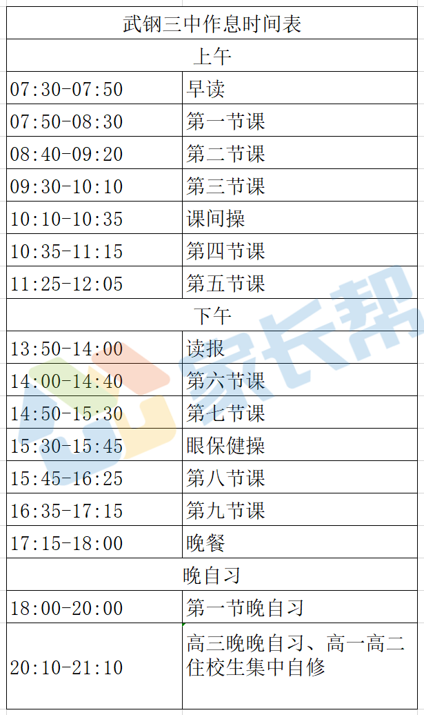 2021秋季就要开学了,武汉学而思1对1的老师们为大家收集整理了青山区武钢三中丨2021-2022学年度高中作息时间表的相关内容,以供大家复习参考。相关阅读:汇总丨2021-2022学年武汉部分高中住宿情况与作息安排
