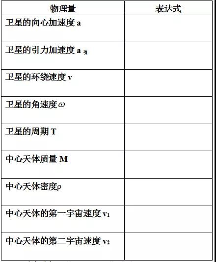 M:中心天体的质量;m:卫星的质量;r:卫星匀速圆周运动的半径;g0:中心天体表面的重力加速度;R:中心天体的半径