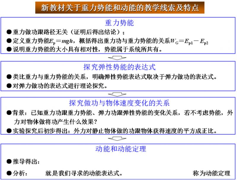 如何更好的理解功能关系,深刻理解功的本质,遵循教材首先学习重力做功与重力势能变化的关系,其次学习探究弹簧弹力做功与弹性势能的变化关系,最后通过探究功与速度变化的关系,在匀变速直线运动模型条件下理论推导合外力做功与动能变化的关系。