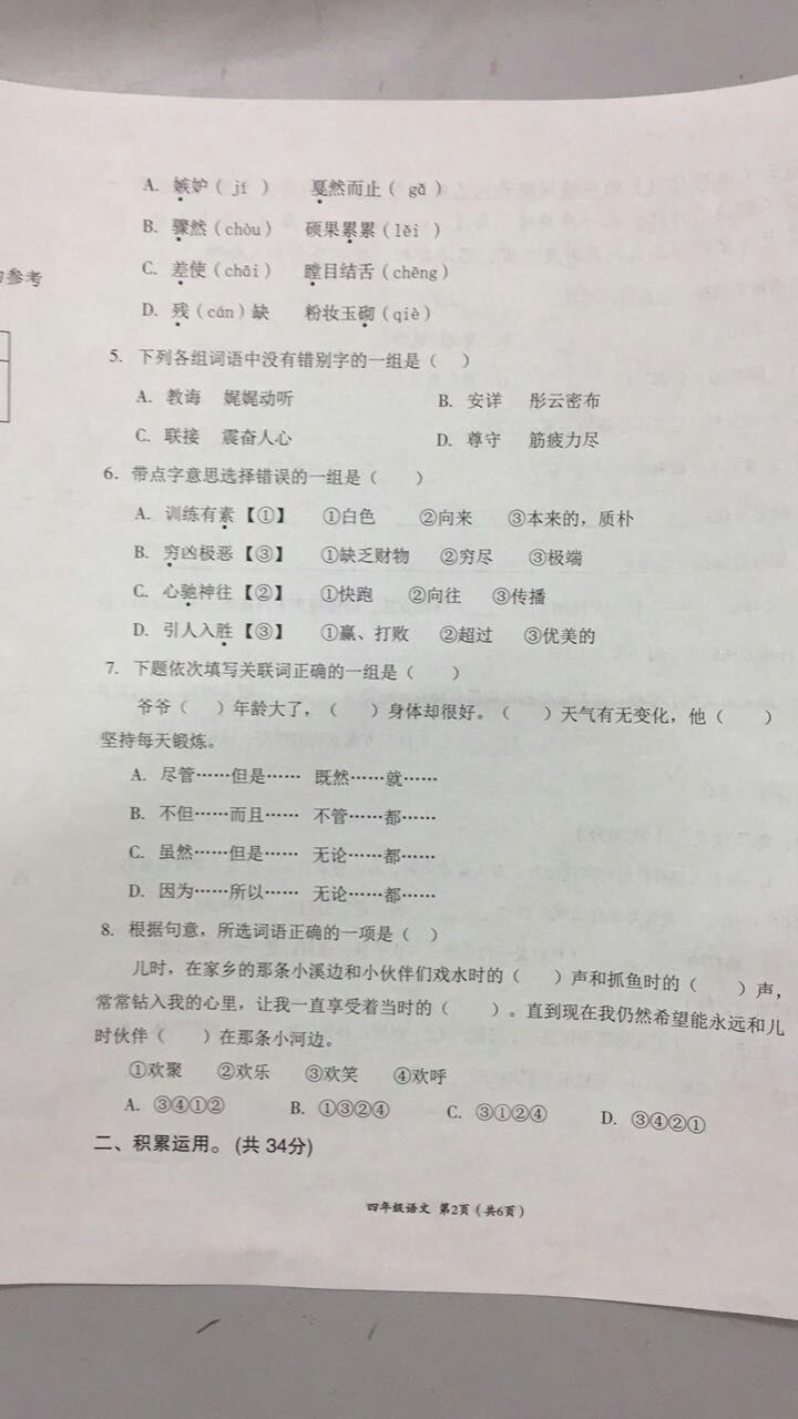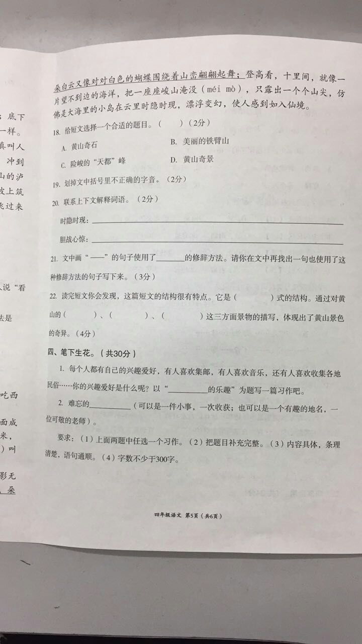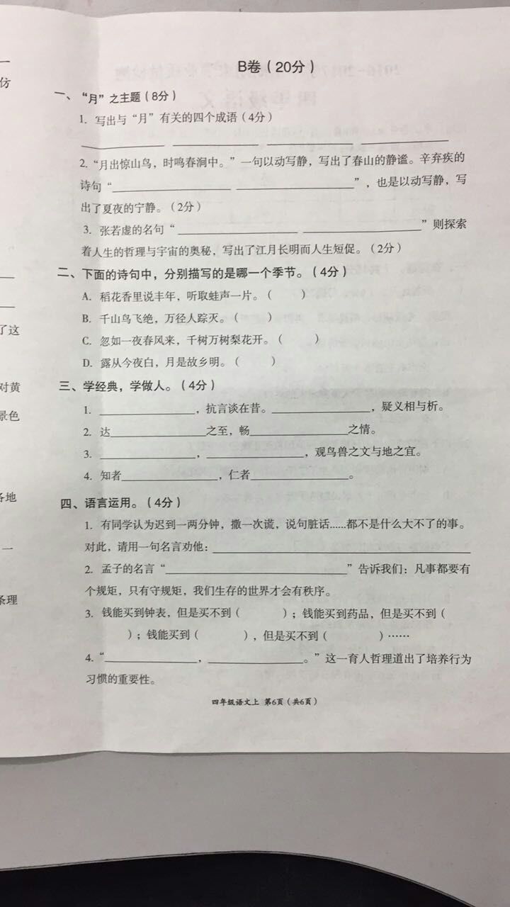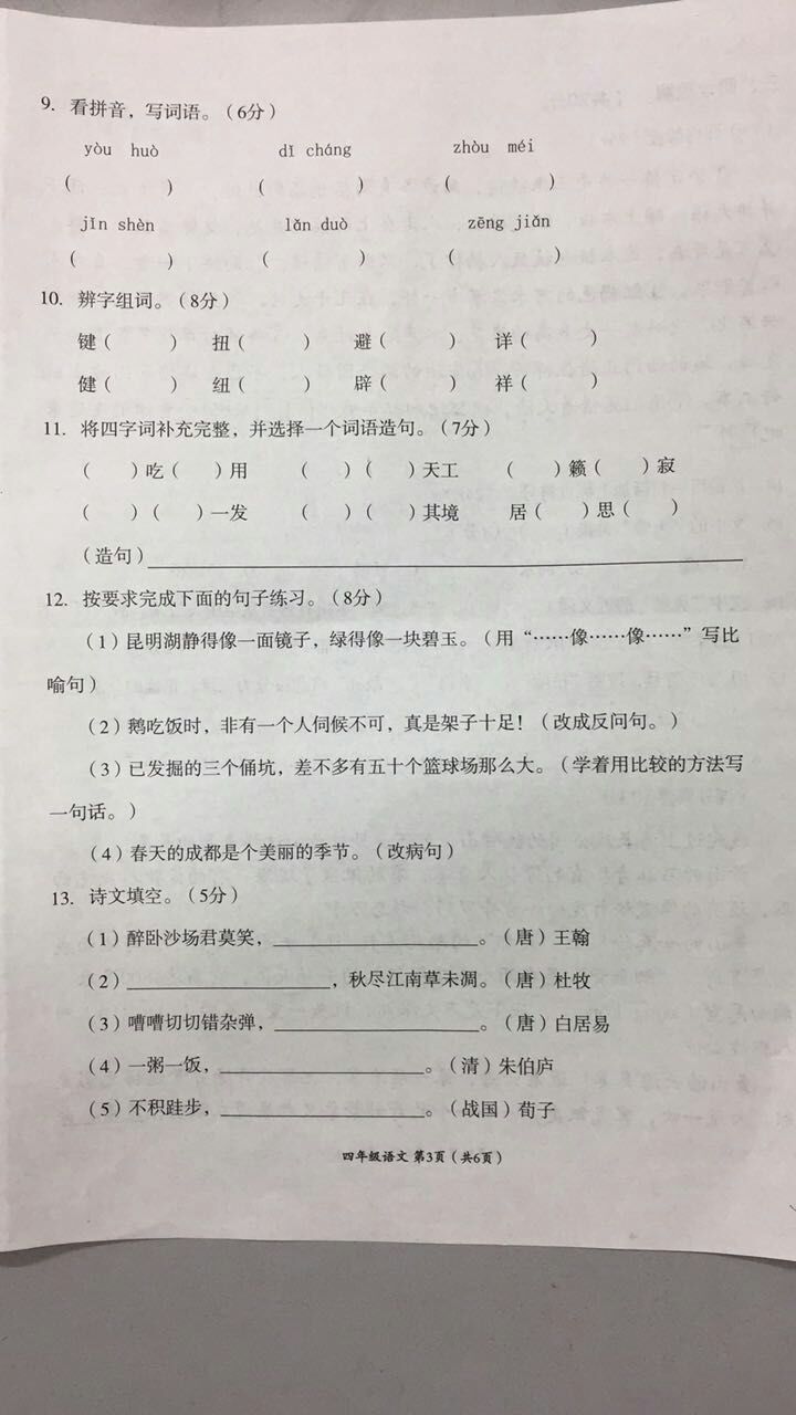 2016-2017学年成都高新区四年级语文期末试卷