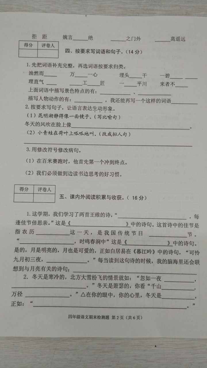 2016-2017学年成都青羊区四年级语文期末试卷