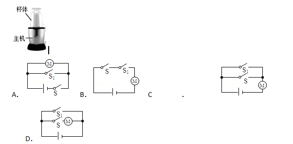 34.如图是某品牌榨汁机,为保障安全,该榨汁机设置了电源开关s和安全开关S1.当杯体放在主机上时,S1自动闭合,此时再闭合S,电动机才能启动,开始榨汁。下列电路图符合上述要求的是()
