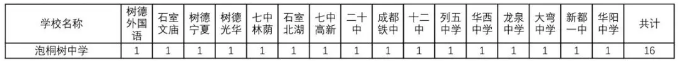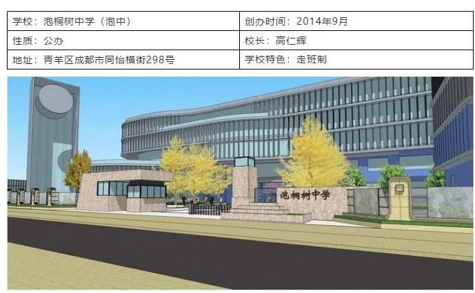 成都市泡桐树中学,位于三环内青羊区金沙片区同怡横街298号,学校属“纯公办高完中”建制,2014先期开办初中,办学初期借用金沙小学校舍上课,2015年9月搬迁至现在的新校区。