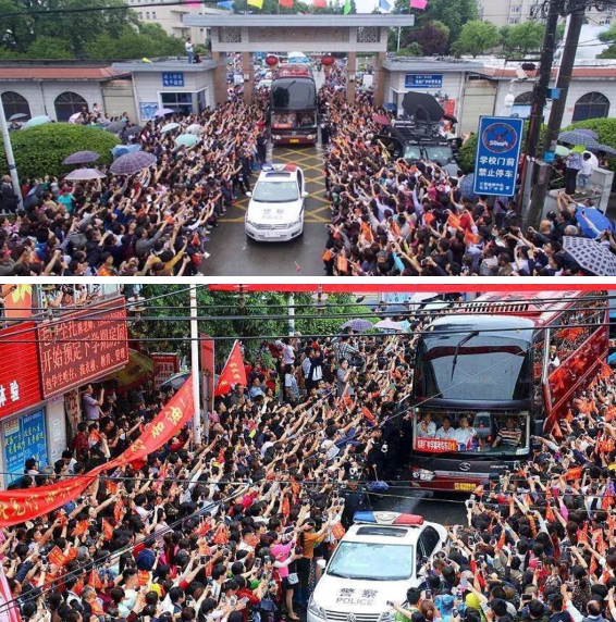 安徽省六安市毛坦厂中学5000多名高三考生集中乘车赴六安城区参加高考,毛坦厂镇万人空巷,数万居民、师生及学生家长早早地来到毛坦厂中学校园和校园门前的学府路上,为考生送行。