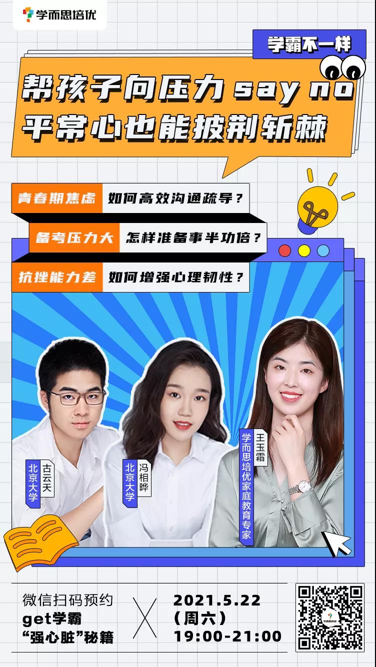 本周六,我们特别邀请北京大学的两位学霸和学而思培优的家庭教育专家,分享他们的心态调整小妙招,帮孩子向压力say no,一起用平常心披荆斩棘!