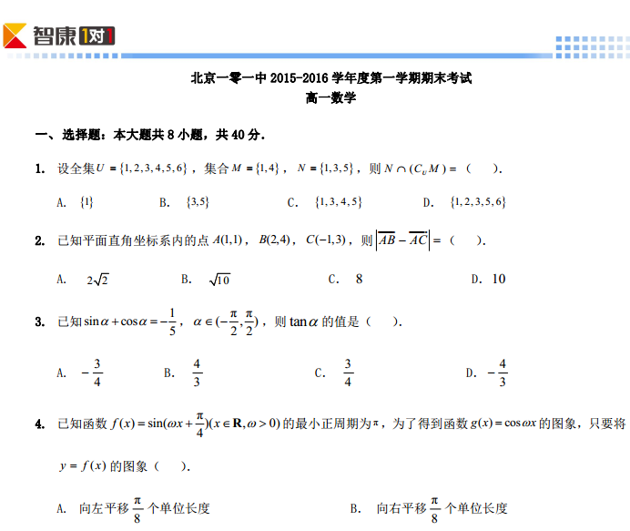 2015-2016北京101中学高一(上)期末数学(含解析)析为大家介绍好了,如果同学们在高中期末诊断准备中还有什么问题的话,请直接拨打智康网高中频道免费咨询电话:4000-121-121,会有专业的高中权威老师为您解答!