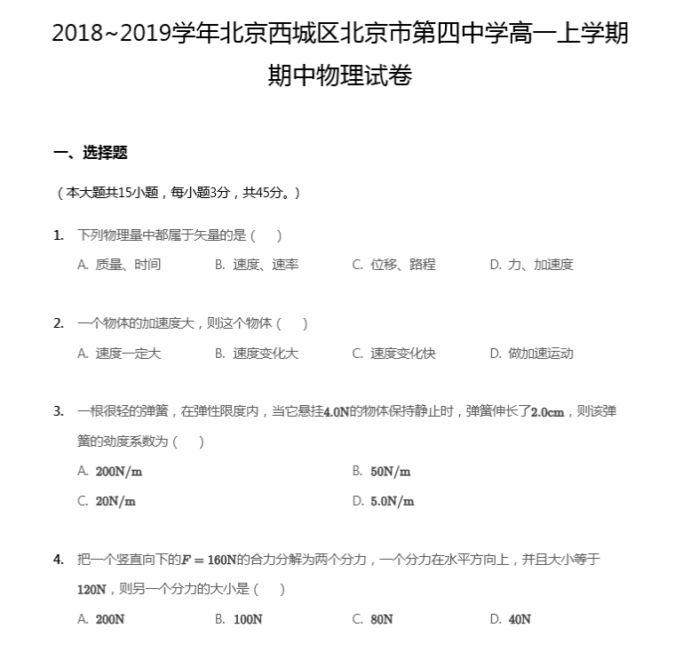 北京四中高一期中试题,物理学习做题少不了!高一的同学们相信也对物理学科并不陌生,物理学起来不简单,需要更多更透彻的理解配合做题,小伙伴们一定要加油哦~~下面小编就给大家带来北京四中高一期中试题,物理学习做题少不了,希望对大家有所帮助哦!