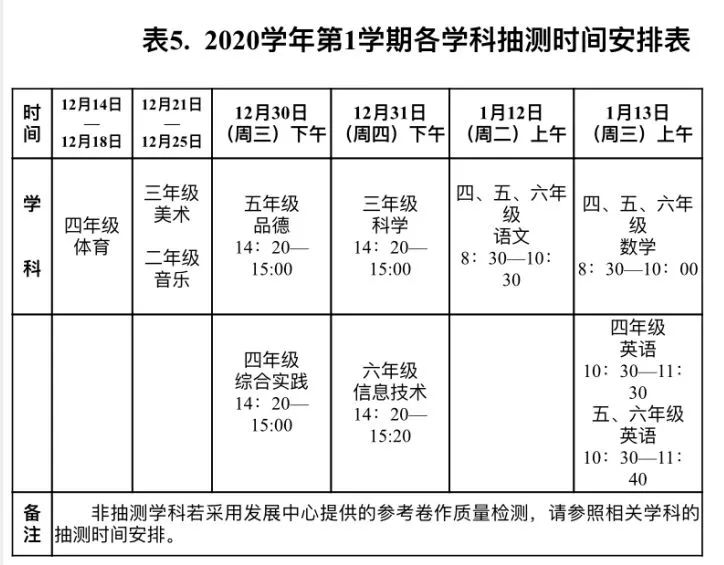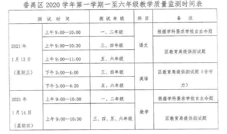 小编这只拿到了小学的期末考试时间表,从图片可以看出,番禺区小学期末考安排在1月13-14这两天。一二年级学校自主命题,三四五六由教育局统一提供测试题。