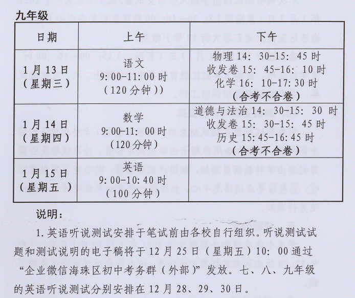 海珠区初中期末考安排在1月13-15日三天进行,上午为语数英三大主科,下午则为道德与法治、历史合考不合卷。