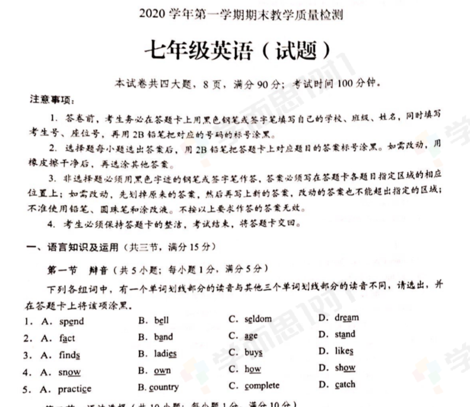 我们为大家整理了2020至2021学年广州白云区区初一上学期期末英语试卷及答案,期末考,它不但可以检测孩子们在上学期的学习水平,也能让大家及孩子清楚学习成果,了解存在的问题,在往后的学习中加以去优化。初中是小学到高中的一个中间点,每一场考试是一个总结点。大家可以先行下载往年的试卷进行练习。