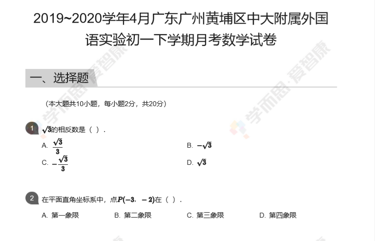 小编为大家整理了2019-2020年3月广东广州黄浦区中大附属外国语实验中学初一下学期月考数学试卷及答案,考试是检验一个学习成果的考试,这其中的重要性不言而喻。