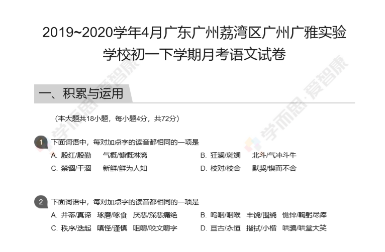 小编为大家整理了2019-2020年4月广东广州荔湾区广州广雅实验学校初一下学期月考语文试卷及答案,考试是检验一个学习成果的考试,这其中的重要性不言而喻。