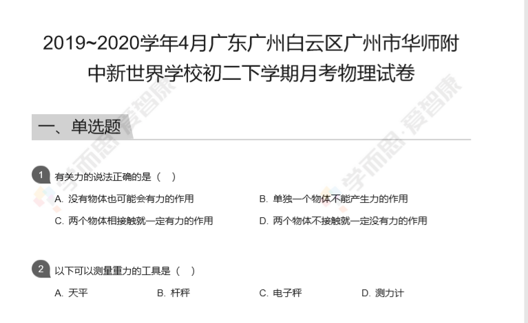 小编为大家整理了2019_2020学年4月广东广州白云区广州市华师附中新世界学校初二下学期月考物理试卷,考试是检验一个学习成果的考试,这其中的重要性不言而喻。