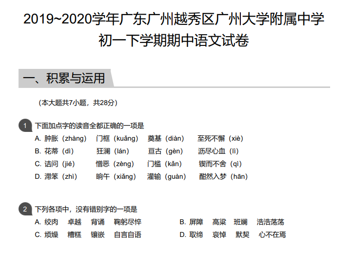 以上内容即是小编整理的2019_2020学年广东广州越秀区广州大学附属中学初一下学期期中语文试卷及答案,如需更多资料点击链接可获取。