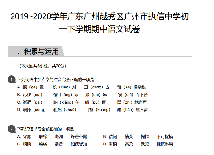 以上内容即是小编整理的2019_2020学年广东广州越秀区广州市执信中学初一下学期期中语文试卷及答案,如需更多资料点击链接可获取。