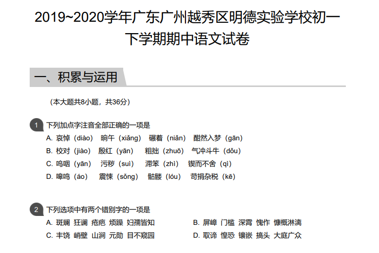 以上内容即是小编整理的2019_2020学年广东广州越秀区明德实验学校初一下学期期中语文试卷及答案,如需更多资料点击链接可获取。