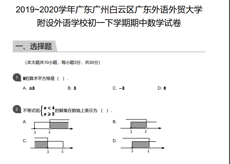 以上内容即是小编整理的2019_2020学年广东广州白云区广东外语外贸大学附设外语学校初一下学期期中数学试卷及答案,如需更多资料点击链接可获取。