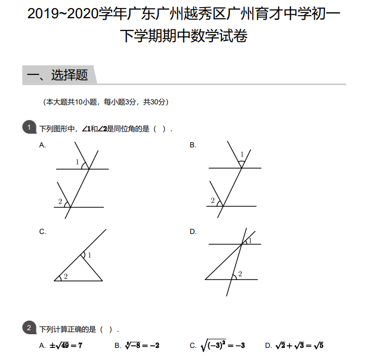 以上内容即是小编整理的2019_2020学年广东广州越秀区广州育才中学初一下学期期中数学试卷及答案,如需更多资料点击链接可获取。