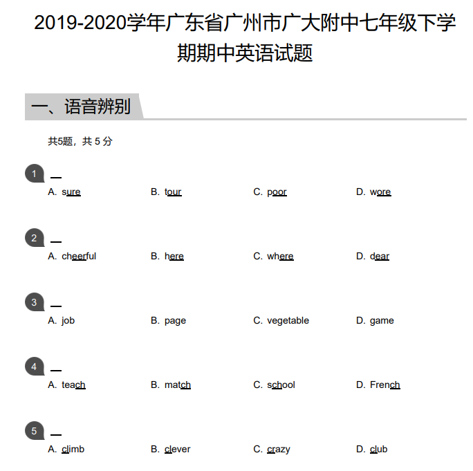 以上内容即是小编整理的2019_2020学年广东广州越秀区广州大学附属中学初一下学期期中英语试卷及答案,如需更多资料点击链接可获取。