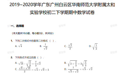小编为大家整理了2019~2020学年广东广州白云区华南师范大学附属太和实验学校初二下学期期中数学试卷及答案,初中,是中学阶段的初级阶段,是向高级中学过渡的一个阶段。八年级是整个中学的转折点,亦是“储力”的一年。